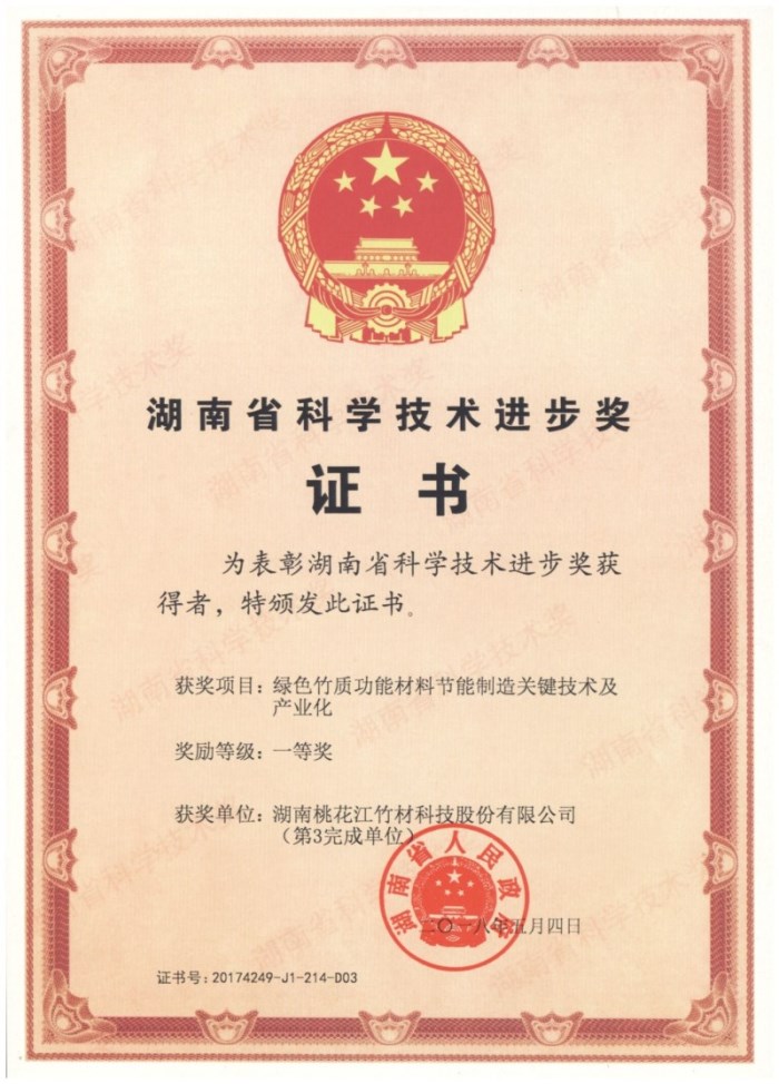 其中, 湖南桃花江竹材科技股份有限公司的綠色竹質(zhì)功能材料節(jié)能制造關(guān)鍵技術(shù)及產(chǎn)業(yè)化項(xiàng)目榮獲2017年湖南省科學(xué)技術(shù)進(jìn)步一等獎(jiǎng)。